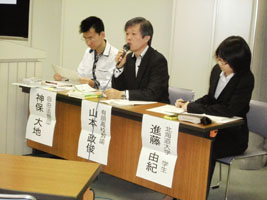 パネラーは法律の専門家として、若手弁護士の神保大地さん、教育実践者として、憲法出前授業で全道を駆け巡る山本政俊さんにお願いしました。さらに、若者から見た憲法観を語ってもらおうと、北大で山本さんの講義を受講している教員志望の大学生にもパネラーを引き受けていただきました。コーディネーターは自らも豊富な授業実践を行っている松本徹さんが務めました。